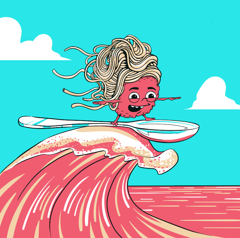 Semolina is a well-regarded store specializing in handcrafted pasta, sauces, and imported Italian goods. They wanted to add some fun items to their merchandise line. This was a dream project where I could really go all out creatively. We landed on The Surfing Meatball character, which later became a T-Shirt. 'Nood' Beach, a play on words and 2 dueling Gladiator Noodles. Stand-up comedian Kyle Kinane is a proud owner of the meatball shirt. (image below)